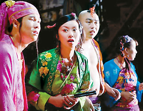 其一,全片表現(xiàn)以“鬧劇”式的敘事假定性(擬古而又將年代模糊化,中英語錯雜使用),劇中角色一個個俱成了從屬于“無厘頭化”情節(jié)進程的符碼,遺去原版人物之“神”而僅存其形、其皮,全都平庸而了無新意。諸如張三、李四、王麻子再饒上兩個添油加醋的小小伙計趙六與陳七(毛毛扮演);ㄉ200萬美金買來的這個版權,如此做法,不但堪稱極盡奢侈的浪費,同時也標示了主創(chuàng)者創(chuàng)意能力的喪失而淪為匠藝般的“東施效顰”。