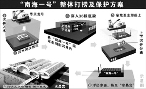 2007年11月13日,工程技術(shù)人員特別是潛水員經(jīng)過60天苦戰(zhàn),終于將已經(jīng)裝有“南海一號”的巨型鋼沉箱的36根底托梁全部穿引完畢,隨后,施工人員在底托梁之間的空當(dāng)穿進(jìn)37 塊厚度為12毫米的鋼板,使底部密封,以保證起浮時沉箱中的泥沙不會外泄,確保古船不會受到損害。2007年12月22日,隨著“南海一號”整體打撈工程總指揮吳建成一聲令下,廣州打撈局為此次打撈特別定制的4000噸全回轉(zhuǎn)起重船“華天龍”和載重能力1.5萬噸的“重任1601”半潛駁輪一起緩緩把裝載有“南海一號”的沉箱吊出水面。12月23日,在拖輪的牽引護(hù)航下,裝載著沉箱和“南海一號”的“重任1601”巨型駁輪被緩緩拉向陽江海陵島的十里銀灘。在那片潔白的沙灘上,新建成的廣東海上絲綢之路博物館(也被稱為“水晶宮”)正在靜靜地等候著它的到來。12月28日,“南海一號”正式入住“水晶宮 ”。至此,“南海一號”整體打撈工作畫上圓滿的句號。