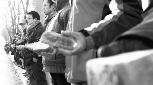 12月20日下午,北京008國際藝術(shù)區(qū)(以下簡稱008藝術(shù)區(qū))門口,30余名藝術(shù)家站成兩排,手持從拆遷廢墟中撿來的磚頭,眼睛死死盯著遠(yuǎn)方,足足站了1個小時。