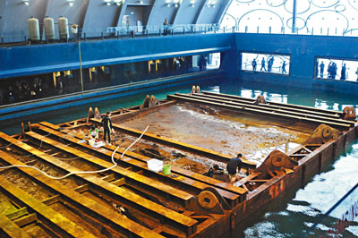 博物館主場南海一號古船所在的沉箱,考古隊員正進行一場水下考古挖掘的動態(tài)演示。經(jīng)過幾天的放水調試,沉箱的其中兩個探方已微露船舷。據(jù)稱,沉箱仍不會立即打開,這是為了保護古沉船的微環(huán)境?脊湃藛T將采取逐層打開的措施,一點一點地發(fā)掘,同時,也有3名蛙人在水下作業(yè)。