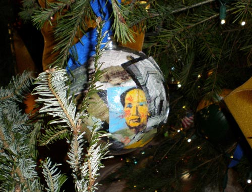據(jù)12月25日出版的《環(huán)球時報》報道,在奧巴馬入主白宮的首個圣誕節(jié),擺放在白宮藍廳中央的一棵圣誕樹,引起外界的強烈興趣。這棵圣誕樹由奧巴馬夫人米歇爾親自“裝扮”,上面懸掛了中國領袖毛澤東頭像的裝飾。