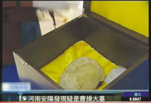 “這個(gè)墓里,發(fā)現(xiàn)石璧三個(gè),圭一個(gè)。圭壁合一,是判斷一個(gè)帝王陵墓等級(jí)級(jí)別的一個(gè)非常重要的標(biāo)準(zhǔn)!必(fù)責(zé)挖掘工作的河南省文物考古研究所副研究員、考古隊(duì)隊(duì)長(zhǎng)潘偉斌說(shuō)。據(jù)介紹,除上述器物外,該墓還出土有大量畫像石殘塊。這批畫像石畫工精細(xì)嫻熟,雕刻精美,內(nèi)容豐富,有“神獸”、“七女復(fù)仇”等圖案,并刻有“主簿車”、“咸陽(yáng)令”、“紀(jì)梁”、“侍郎”、“宋王車”、“文王十子”等文字,堪稱精品。在墓室清理中,發(fā)現(xiàn)有人頭骨、肢骨等部分遺骨,專家初步鑒定為一男兩女3個(gè)個(gè)體,其中墓主人為男性,年齡在60歲左右,與曹操的卒年66歲相吻合。經(jīng)研究,認(rèn)定這座東漢大墓為文獻(xiàn)中記載的魏武王曹操高陵。