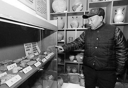 周圍村子里有幾個磚廠,燒窯就要取土,每次他都等在現(xiàn)場,總會從灰土里找到一些東西,有帶著銅銹的刺鉤、刻著銘文的瓦當(dāng),還有一些用于占卜的骨頭。他把自家三開間的東廂房,專門安置收藏的文物供人參觀。陶器、瓷器、青銅器,他收藏了有上千件,除了自己撿到的,還有一小部分是他買來的,花錢并不多。