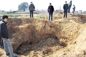 一同前來的南京市博物館考古部工作人員表示,此地距離固城遺址只有不足千米的距離,從現(xiàn)場推斷,這里至少有10余座兩漢時(shí)期的墓葬,而且多是兩漢時(shí)期的貴族墓。從現(xiàn)場的挖土機(jī)的抓痕可以看出,這是有目的的盜掘行為。敢于開著挖土機(jī)盜挖古墓群的現(xiàn)象,無論在南京還是在江蘇甚至全國,都可以說是盜墓史上的第一次出現(xiàn),性質(zhì)相當(dāng)惡劣。