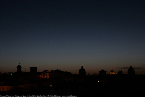 據(jù)美國(guó)太空網(wǎng)報(bào)道,近日,一名意大利天文學(xué)家拍攝到罕見(jiàn)的天象照片:水星和金星同時(shí)在羅馬的夜空閃耀。