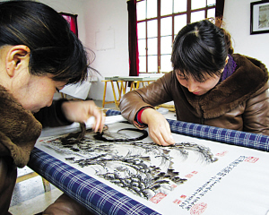 今年“兩會” 期間,溫家寶總理在記者招待會上借《富春山居圖》合璧的話題,表露了華夏兒女期盼祖國統(tǒng)一的心愿。這個信息使江蘇東臺市的工藝美術(shù)工作者大為觸動。因?yàn)樵缭?008年,當(dāng)?shù)氐膬蓚美術(shù)師和8位繡娘歷時9個月曾制作了發(fā)繡作品《富春山居圖》,畫面藍(lán)本是原畫的后半部分《無用師卷》,這部作品在當(dāng)年的第八屆中國工藝美術(shù)大師作品暨中國工藝美術(shù)精品博覽會上獲得了金獎。