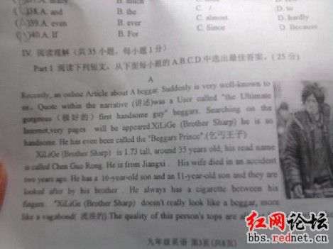 從紅網(wǎng)高校論壇相關(guān)截圖中,網(wǎng)友可以清晰地看到試卷是九年級英語試卷。試卷內(nèi)容簡單介紹了“犀利哥”在網(wǎng)絡上的突然出現(xiàn),并被稱為“乞丐王子”引起了網(wǎng)民的關(guān)注,并在第二段對“犀利哥”的身世等做了一個簡單的介紹。