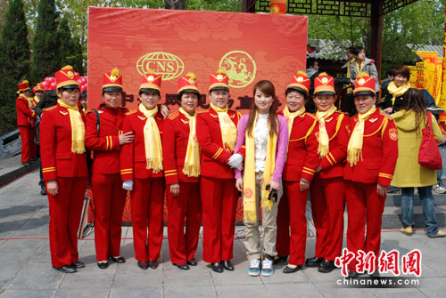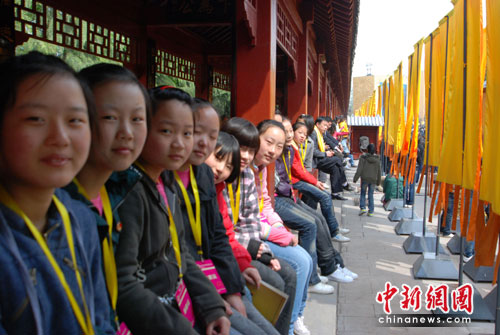 大典進(jìn)行時,各項(xiàng)準(zhǔn)備工作就緒,拜祖場務(wù)人員在拜祖現(xiàn)場等候各項(xiàng)議程的工作安排,他們“忙里偷閑”和中新網(wǎng)直播主持人合影留念。參加放飛和平鴿的兩岸四地的小朋友們靜靜坐在亭子里等候。
