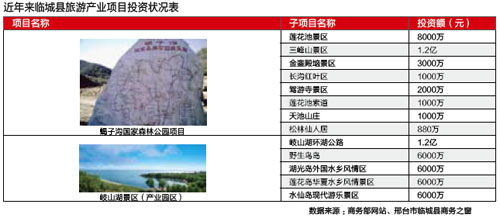 之所以這樣做,對兩地來講都有幾分無奈。臨城多年來苦于沒有一張城市的文化名片,該縣旅游資源豐富,崆山白云洞、天臺山、歧山湖、小天池、宋代普利寺塔 、唐代邢窯遺址。旅游產(chǎn)業(yè)初具規(guī)模,項目投資也很大(見附表),但是,一直缺乏自己的城市名片和旅游品牌,嚴(yán)重制約了當(dāng)?shù)芈糜螛I(yè)的大發(fā)展。