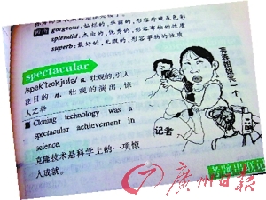 5月6日,芙蓉姐姐在微博上自爆,她由朋友處得知自己被印到了單詞本上做配圖。芙蓉姐姐在微博上寫(xiě)道:“早晨上網(wǎng)時(shí),朋友發(fā)給藕一張圖,說(shuō)是單詞本上的,這個(gè)舉例也太壯觀了吧……”芙蓉姐姐還發(fā)了圖片,記者看到其漫畫(huà)像被用于詮釋英文單詞“spectacular”(壯觀的、引人注目的)。至記者發(fā)稿時(shí)止,該微博被400多人轉(zhuǎn)載,有200多網(wǎng)友對(duì)此發(fā)表評(píng)論。
