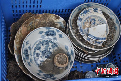 “南澳Ⅰ號”水下考古發(fā)掘于4月上旬開始,但由于南澳天氣、海況復雜多變,水下考古、文物打撈工作被迫中斷。從本月1日開始,南澳天氣狀況有所好轉,水下考古工作重點開始從外圍和表面散落文物的采集,轉向沉船區(qū)域內沉船船體及船載文物的發(fā)掘。目前已經清理可見的文物種類主要是青花瓷大盤,也有少量碗、缽、杯及金屬凝結物。