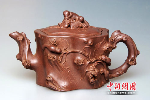 宜興紫砂與“世博”淵源頗深,歷史上曾多次參加世界性博覽會(huì)并獲大獎(jiǎng)。記者現(xiàn)場(chǎng)看到,在歷屆國(guó)際性展覽中獲獎(jiǎng)的6件珍品在展廳內(nèi)光彩耀目,其中在1910年“第一次南洋勸業(yè)會(huì)”上獲金獎(jiǎng)的范大生“大柿子壺”、1915年美國(guó)巴拿馬國(guó)際賽會(huì)獲金獎(jiǎng)的程壽珍“掇球壺”、1926年美國(guó)費(fèi)城藝術(shù)博覽會(huì)獲金質(zhì)獎(jiǎng)的馮桂林“松鼠葡萄壺”等珍品引來眾多文化藝術(shù)界人士爭(zhēng)相一睹芳容。