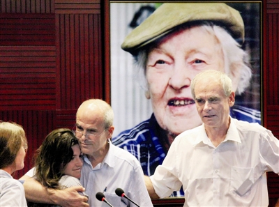 當(dāng)北京外國(guó)語(yǔ)大學(xué)離休教授、90歲的老專家伊麗莎白來到現(xiàn)場(chǎng)后,寒春最小的外孫女走上前擁抱,一老一少相擁而泣。
