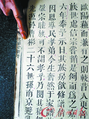 記者在這部由“同文堂字林書(shū)局”印制的族譜起初看到了這樣的記載:“先源于曹彬二十六世孫,南京避亂,世居北京真定府。迄宋之末,公達(dá)祖者因鄉(xiāng)科釋褐,后任選信豐縣正堂……”