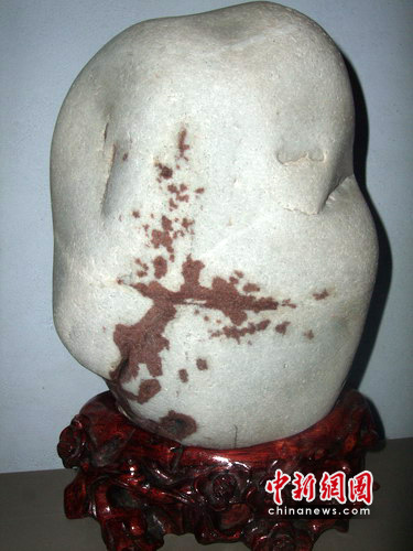 據(jù)蔡建華女士介紹,該石頭是在金沙江屏山縣流域的江邊撿到的。石頭被江水淹沒,被蒙上了厚厚的一層泥灰,退潮時蔡女士在江邊尋找奇石,石頭上的腳踏之處泥灰脫落,白里鑲紅,遂搬回家沖刷干凈,石頭上紅梅傲雪的圖案便躍然顯現(xiàn)。(完)