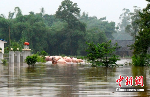 18日早上,中新網(wǎng)記者在受災(zāi)嚴重的重慶潼南柏梓鎮(zhèn)看到,雖然雨已經(jīng)停歇,但鎮(zhèn)上的洪水仍未褪去,多條街道的積水仍有半人深。洪水完全包圍了當?shù)氐囊粋養(yǎng)豬場,近百頭被淹的活豬成片浮在水面上,據(jù)該場工作人員介紹,該豬場養(yǎng)的6000多頭豬均被洪水淹沒,僅17日便死了1000多頭豬。因豬場受困之處水位較深無法救援,豬場場主只能眼睜睜看著豬被洪水沖擊漂浮。