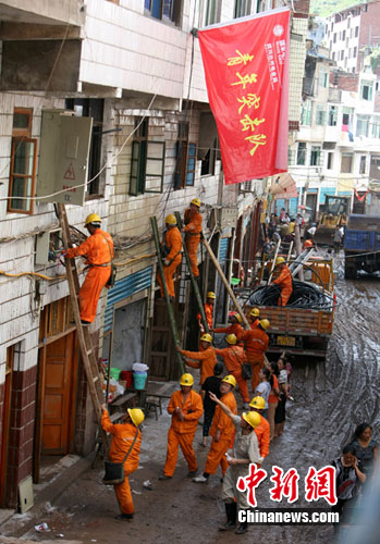 洪災(zāi)過后,江陵鎮(zhèn)熱浪逼人,但在街道上確是一派熱火朝天的場面,氣溫一直持續(xù)38℃以上的高溫,為了讓江陵鎮(zhèn)的受災(zāi)群眾能及時用上電,成都電業(yè)局抗洪搶險突擊隊員們頂著炎炎烈日,揮汗如雨,認真地按照標準規(guī)范架設(shè)著每根電纜線。