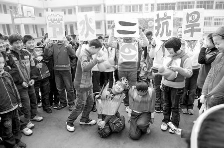 “進(jìn)行這場(chǎng)行為藝術(shù)表演,是想通過節(jié)水等于抗旱的表演,讓同學(xué)們懂得旱情和我們的生活相關(guān)。身在城市,雖然沒法直接參與抗旱,但可以通過節(jié)約用水來幫助農(nóng)民伯伯!眳⒓颖硌莸耐瑢W(xué)們說。首席記者張可丹文記者白周峰圖