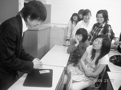 黑遠(yuǎn)智所在的首都師范大學(xué)魔術(shù)社成立于2007年夏天,社團(tuán)總?cè)藬?shù)有100多人,每次都能參加活動(dòng)的有30人左右!敖衲甏和韯⒅t‘火’了以后,我們魔術(shù)社多了很多新面孔!爆F(xiàn)任社長李魏林說。