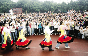 初三和高三的十幾名老師也來(lái)助興,女老師們一身中性的牛仔打扮甩開(kāi)嗓子唱得正歡,男老師們則打了絲巾穿著長(zhǎng)長(zhǎng)的裙子跳著搞笑的舞蹈,有的老師自己也禁不住一邊跳一邊笑,笑痛肚皮的學(xué)生大有人在。“太搞笑,太好玩了,想不到平時(shí)那么嚴(yán)肅的老師還會(huì)跳舞!币晃桓呷哪型瑢W(xué)說(shuō)。