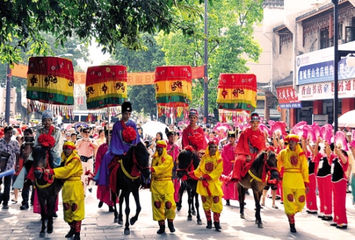 本報德慶訊 通訊員談細(xì)育攝影報道:昨天上午,廣東德慶縣城的宋街和孔廟羅傘羅帳處處,鼓樂齊鳴,四名“狀元”穿著宋代服裝騎著高頭大馬巡游。原來,這里正上演第八場、也是最后一場“狀元禮”。八年來,共有30多名高考“狀元”到廟中參禮, 隨著明年不再公布“狀元”,這一備受爭議的“狀元秀”也將成為歷史。