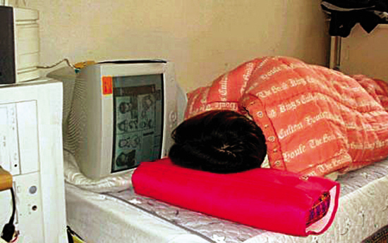 宿舍內(nèi)還有另外兩個(gè)室友留校,不過他們每天早出晚歸都很忙。沒過幾天,小謝就開始感覺到寂寞,自己好像被人遺忘了。呆在宿舍的生活也毫無規(guī)律,每天睡到中午一點(diǎn)左右,醒來時(shí),空蕩蕩的宿舍里僅剩下他一個(gè)人,剛爬下床還沒來得及去洗手間,第一件事就很順手地打開電腦。隨便吃一包泡面,就開始了一天的電腦生活。晚上七點(diǎn)吃晚餐,有時(shí)泡面解決。玩電腦到深夜是必然的事,所以不能沒有宵夜。有時(shí)班上總會(huì)有男生煮東西,會(huì)一起吃,不然隨便吃點(diǎn)零食充饑。