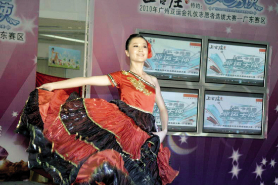 “卡丹路亞運(yùn)天使·廣州2010年亞運(yùn)會(huì)禮儀志愿者選拔大賽”廣東賽區(qū)的首場(chǎng)晉級(jí)賽9月13日下午在廣州展開(kāi)。廣州分賽區(qū)500多位報(bào)名參賽者中通過(guò)初步篩選的前30名選手,經(jīng)過(guò)一番現(xiàn)場(chǎng)比拼后,最終有20名晉級(jí)廣東賽區(qū)“百?gòu)?qiáng)”。
