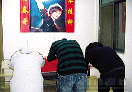 日前,某高校物理學(xué)院同學(xué)小梅在校內(nèi)網(wǎng)上偶然發(fā)現(xiàn)一組雷人的照片:幾名同學(xué)在寢室客廳里貼上了一張巨大的李宇春的海報(bào),兩側(cè)的紅對(duì)聯(lián)上赫然寫著“信春哥,不掛科”。對(duì)聯(lián)前方是一張鋪著紅布的長方形桌子,上面擺有香煙裊裊的香爐和水果。春哥前,幾個(gè)虔誠的春哥“信徒”手執(zhí)高香,頂禮膜拜。