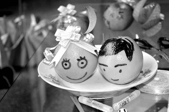“水果賀卡是種取代傳統(tǒng)紙質(zhì)卡片的新型賀卡,以蘋果、橙子、香蕉等日常水果為材料,用在上面寫字、繪畫、粘貼寫有祝福語的彩色絲帶等方式來裝扮。”