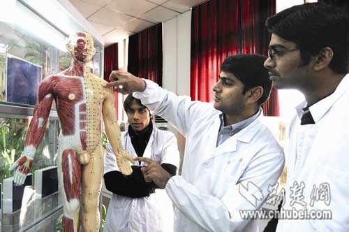 湖北中醫(yī)學(xué)院是教育部首批批準(zhǔn)的接受留學(xué)生的院校之一。目前,在該院海外教育學(xué)院,已有來自20多個(gè)國(guó)家和地區(qū)的“洋學(xué)生”,他們用不同的語言,解讀著對(duì)他們來說極其神秘的中華文明。
