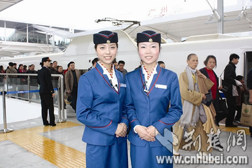 從11月上旬開始,經(jīng)過理論培訓的“準動姐”分別登車至武——京、武——滬線時速250公里的動車組進行試崗操作,開始帶妝為乘客服務。