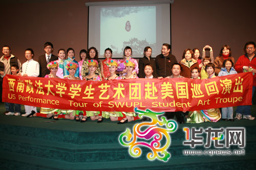 1月26日晚,巡演團(tuán)在美國蒙大拿州密蘇拉市劇院舉行赴美首場演出,同時(shí)慶祝西南政法大學(xué)與蒙大拿大學(xué)合辦的蒙大拿大學(xué)孔子學(xué)院正式揭牌。2月5日中午12時(shí),巡演團(tuán)在俄亥俄州的克里夫蘭州立大學(xué)完成赴美的最后一場演出,美方院長陳麗卿博士將此次演出譽(yù)為該院承辦的最成功的演出。