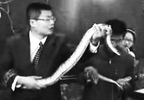 將一條長(zhǎng)達(dá)2米多、重達(dá)5公斤的蟒蛇抱到課堂上當(dāng)“模特”,教學(xué)生學(xué)習(xí)動(dòng)物寫(xiě)生的技巧。武漢市第五十九中教師鄒華章抱蟒蛇上課的視頻,近日在網(wǎng)絡(luò)上瘋傳。從10月27日上網(wǎng)到昨日,共有400多個(gè)網(wǎng)站轉(zhuǎn)載這一視頻,其中在一家網(wǎng)站的點(diǎn)擊率已高達(dá)12.6萬(wàn)人次。