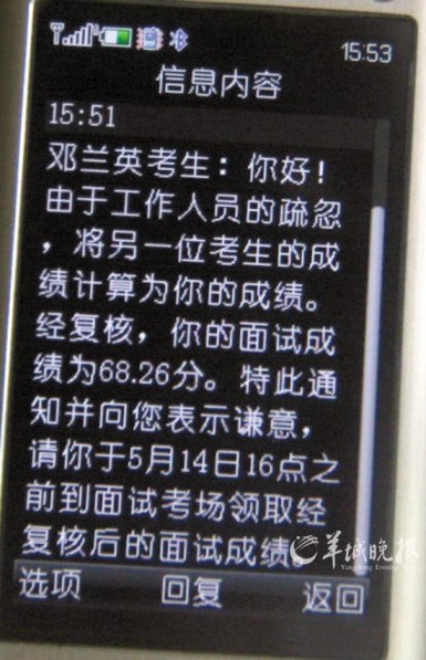 該負(fù)責(zé)人稱(chēng),得知此情況,他馬上叫一名姓蘇的工作人員電話告知鄧蘭英,告訴她剛才所發(fā)的成績(jī)通知書(shū)中,成績(jī)有誤,要求她返回考場(chǎng)更正。鄧聽(tīng)后說(shuō),她已坐車(chē)在返回到徐聞的路上,該局人員于是承諾可支付其交通費(fèi),叫她速返回考場(chǎng)。但鄧不同意,最后,工作人員只好用手機(jī)13413633948(記者注:考場(chǎng)工作值班用的電話)發(fā)給鄧短信,對(duì)搞錯(cuò)其成績(jī)一事表示抱歉并吩咐她于5月14日下午4時(shí)前到面試考場(chǎng)取經(jīng)復(fù)核后的面試成績(jī)(注:鄧收到短信時(shí)間是5月12日16時(shí)47分)。