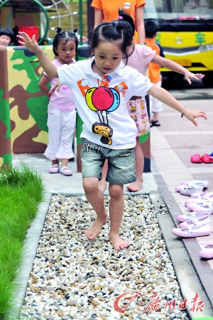 本報訊 (記者陳昕宇)赤足踩碎石、晨練時需要過“梅花樁”、俯身貼地穿越水管、輕舒猿臂通過懸掛在半空中的吊臂、寒冬冷水浴……上述情景不是出現(xiàn)在特種部隊的訓練營中,而是佛山一所位于高檔住宅小區(qū)的幼兒園專為幼兒所開設的生存磨難教育課程。 據(jù)介紹,生存磨難課程最早起源于日本教育界,目的為磨煉學生的意志。昨日,記者來到該所幼兒園,對生存磨難教育的部分項目進行了體驗。