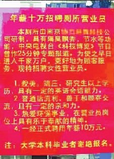 這條招聘啟事上商家自稱(chēng)中央電視臺(tái)“科技博覽”曾經(jīng)作25分鐘專(zhuān)題報(bào)道。要招端莊,貌美,研究生以上學(xué)歷,具備—定英文會(huì)話能力,年薪10萬(wàn),謝絕大學(xué)本科學(xué)歷者報(bào)名。