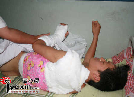 5月16日,記者在昌吉市人民醫(yī)院外一科見(jiàn)到了受傷的朱斌,他側(cè)著躺在病床上,說(shuō)起話來(lái)很吃力。他的左臂、背部、胸部,腿部都被包扎了起來(lái)。