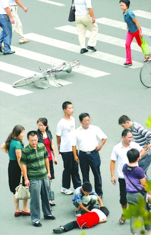 見此一幕,一名戴著眼鏡的過路男子急忙撥打求救電話。這時(shí),出租車司機(jī)和一名小男孩也趕了過來,焦急地看著躺在地上的小女孩。小男孩說,他是附近23中的學(xué)生,被車撞到的是他的表妹,才10歲,在經(jīng)三路小學(xué)上學(xué)。當(dāng)時(shí),他們兩人從金水路南側(cè)沿著路口東邊的斑馬線橫過金水路,小女孩在前面,小男孩推著自行車走在后面。他看著遠(yuǎn)遠(yuǎn)有一輛出租車速度很快地從東往西向表妹撞去。見表妹被撞飛出去,小男孩扔下自行車連忙跑了過來。任憑這名男孩如何呼叫,小女孩只是發(fā)出“哼哼”的聲音卻說不出話來。