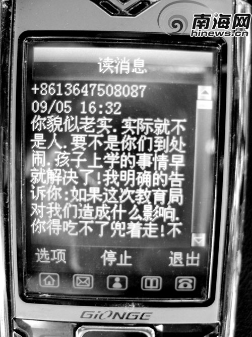 王才子給記者看了王校長辱罵他的短信。記者看了其中一條短信內(nèi)容:“你貌似老實(shí),實(shí)際就不是人,要不是你們到處鬧,孩子上學(xué)的事情早就解決了!我明確告訴你,如果這次教育局對(duì)我們?cè)斐墒裁从绊,讓你吃不了兜著?”另一條短信內(nèi)容是:“象你這種貪得無厭的人,不但不想讓你孩子上好學(xué)校,還想拿孩子來賺錢,等我忙完了這整(原文如此——記者注)子,會(huì)找人跟你算清楚的!”