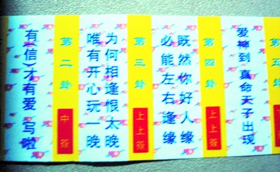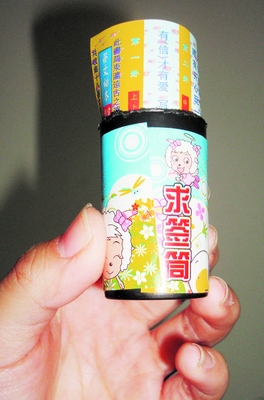 記者打開“求簽筒”,看到所謂“簽文”上寫有“恭喜,恭喜,你終于有喜”等內容。記者仔細看了一下,竟發(fā)現“簽文”中有不少錯別字。