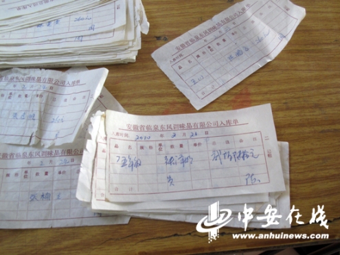李校長(zhǎng)還給記者出示了今年收取260元費(fèi)用的收據(jù),收據(jù)上居然印著“安徽省臨泉東風(fēng)調(diào)味品有限公司入庫單”的字樣,上面寫著學(xué)生的姓名、班級(jí)和所交的260元費(fèi)用,每一張右下角都是用相同筆跡簽了一個(gè)“周”字,據(jù)李校長(zhǎng)介紹簽“周”字的人是陳子玉的兒媳婦,她負(fù)責(zé)來學(xué)校收錢。
