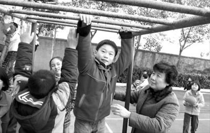 四年級(jí)的汪強(qiáng)投籃不小心摔倒在地,陶阿姨立即跑上前幫忙;四年級(jí)的幾位男生喜歡吊單桿,陶阿姨站在一邊做保護(hù)……今天早晨7:40,記者在浦東南路小學(xué)看到,護(hù)導(dǎo)老師和保安在校門(mén)口迎接每一位到校的學(xué)生;提前到校的學(xué)生,在附近居民志愿者的指導(dǎo)下,在操場(chǎng)上參加各種體育運(yùn)動(dòng)。