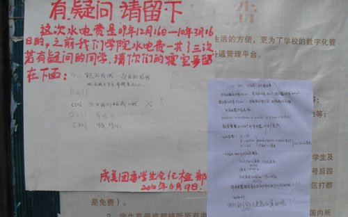 隨后,該校后勤部工作人員張貼了一份通知向?qū)W生解釋。通知寫(xiě)道:“該表為學(xué)生公寓2009年9月~2010年3月學(xué)生公寓應(yīng)交水電費(fèi);實(shí)際計(jì)量水、電月份分別為2009年10月、11月、12月,2010年1月、3月(1月10日~2月28日寒假)!