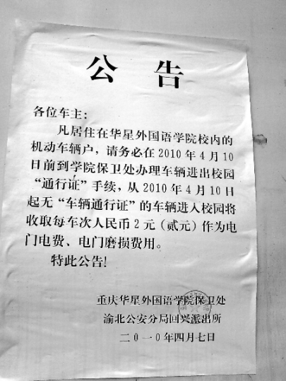 “我們住戶和學(xué)校完全是兩個(gè)獨(dú)立個(gè)體,學(xué)校根本沒有任何權(quán)力向我們收費(fèi)!奔易∪A星外國語學(xué)院家屬樓1單元5樓的住戶龍兵生說,本月7日,學(xué)校保衛(wèi)處在大門口通報(bào)欄處貼了一則收費(fèi)公告,要求凡居住在校內(nèi)有機(jī)動車輛的住戶務(wù)必在本月10號前到學(xué)院保衛(wèi)處辦理進(jìn)出“通行證”手續(xù),否則將向進(jìn)出校園的無“車輛通行證”的住戶,收取每人每車次2元,作為電門電費(fèi)、電門磨損費(fèi)用。