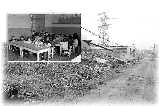 杭州豐潭路邊的方家塘村早就開(kāi)始拆遷了,現(xiàn)在周?chē)呀?jīng)沒(méi)有居民,可是唯獨(dú)村中的幼兒園卻遲遲沒(méi)有搬遷,孩子們?nèi)匀辉趶U墟里上課。廢墟中的幼兒園成了一座孤島。