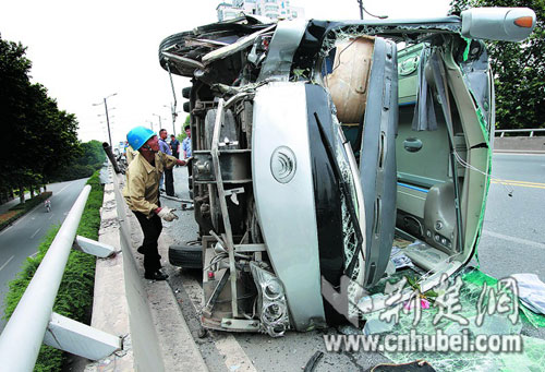 荊楚網(wǎng)消息 (楚天都市報(bào)) (記者許洋)昨日11時(shí)55分,一輛滿(mǎn)載35名大學(xué)師生的大客車(chē)行至青山建設(shè)五路立交橋時(shí),與一輛同向行駛的轎車(chē)發(fā)生碰撞,客車(chē)側(cè)翻在立交橋橋面上,約有6名學(xué)生出現(xiàn)腦外傷、骨折。