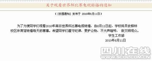 西財(cái)在校學(xué)生小徐在本報(bào)大成網(wǎng)新聞報(bào)料臺(tái)轉(zhuǎn)發(fā)了這則通知:“2010年南非世界杯開(kāi)幕在即,世界杯比賽期間正值國(guó)家英語(yǔ)四六級(jí)考試和期末復(fù)習(xí)考試階段,為了維護(hù)學(xué)校的正常教學(xué)和生活秩序,確保同學(xué)們能夠正常的休息,以良好的狀態(tài)溫課迎考,應(yīng)廣大同學(xué)和學(xué)生家長(zhǎng)的要求,學(xué)校決定自6月11日起至賽事結(jié)束,學(xué)生公寓熄燈以后校園網(wǎng)絡(luò)也將暫停使用。”
