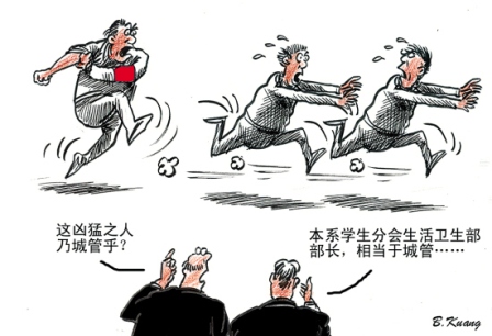 區(qū)區(qū)一件衛(wèi)生檢查的小事,何以弄成一樁血案?學(xué)生干部及學(xué)生之間的溝通對(duì)話(huà)能力為何如此之弱以至于拔刀相向,值得家長(zhǎng)及教育人士思考。而學(xué)生會(huì)干部的“過(guò)度執(zhí)法”,是否也折射了學(xué)生會(huì)這個(gè)“準(zhǔn)官場(chǎng)”的惡習(xí)呢? 文/丫丫