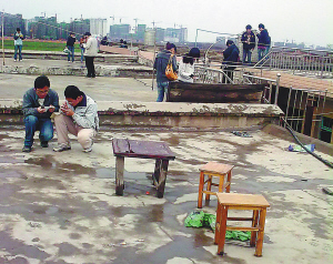 3月 28日上午,是今年全國(guó)計(jì)算機(jī)考試的筆試時(shí)間,據(jù)該學(xué)員說(shuō),老師考前讓每名考生帶一位親友,統(tǒng)一在學(xué)校教室集合。筆試開(kāi)始幾分鐘后,教室里的老師便得到了考題。老師在黑板上一行行地寫出了:1-5324431-641423……人們紛紛拿出手機(jī)(見(jiàn)上圖)。20多分鐘后,這名老師擦去黑板上的字,急急離去。由于朱洪學(xué)校當(dāng)天參加筆試的約有幾百名學(xué)員,從教室里到外面空地,忙著發(fā)送短信的考生親友隨處可見(jiàn)(見(jiàn)下圖)。該知情者說(shuō),那名老師寫在黑板上的 “32443”分別代表著“CBDDC”,這些“數(shù)字”和隨后寫出的“漢字”,便是筆試中的“選擇題”和“填空題”的答案。