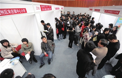 昨天,近幾年來本市首場中小學(xué)教師專場招聘會(huì)在首師大體育館舉行,1.3萬名北京高校應(yīng)屆畢業(yè)生蜂擁而至,競爭132家本市中小學(xué)提供的1100余個(gè)崗位。在招聘現(xiàn)場,市區(qū)學(xué)校攤位前人頭攢動(dòng),而郊區(qū)學(xué)校則門可羅雀,兩極分化嚴(yán)重。